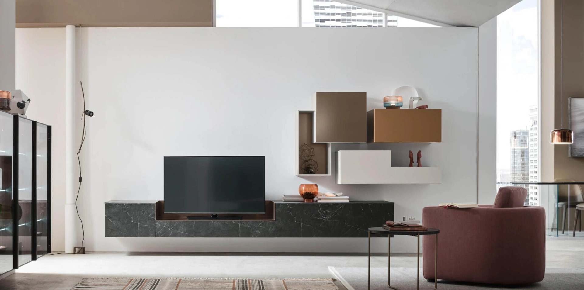 A muro o freestanding per organizzare al meglio un open space, le più originali composizioni d’arredo in commercio arredano il living sfruttando bene lo spazio disponibile. La Parete Attrezzata Seta Comp SU2201 di Maronese in foto possiede componibilità personalizzabile e diverse possibilità di caratterizzazione: scopri la parete attrezzata qui disponibile e contattaci per maggiori info e preventivi. Per soddisfare le eterogenee problematiche abitative di ognuno, marchio mette a disposizione dei suoi clienti una ricca gamma Pareti Attrezzate moderne particolarmente funzionali e connotate da un'estetica raffinata.